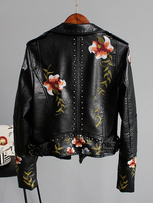 Women's Floral Print Embroidery Faux Soft Leather Jacket